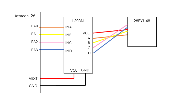 모터드라이버에 STEP 단자에 모터의 핀을 그대로 연결하고 INA~D 핀을 PA0~3으로 연결해준다.