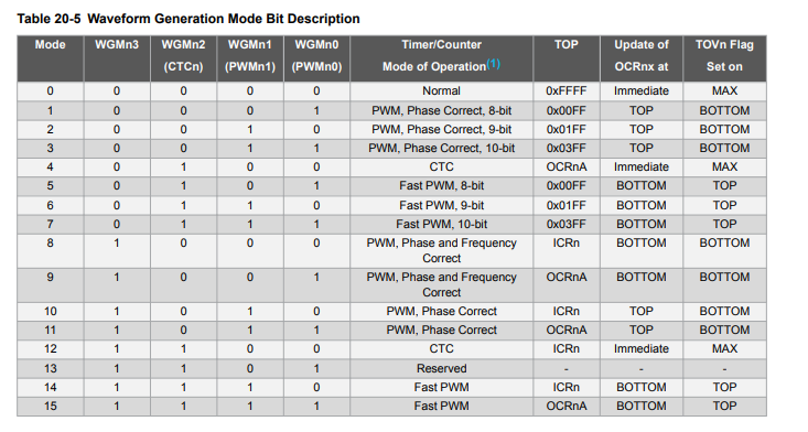이번 예제에서는 14번 모드를 설정하여 ICRn을 사용해 TOP을 설정하고 Fast PWM 모드로 제어한다.