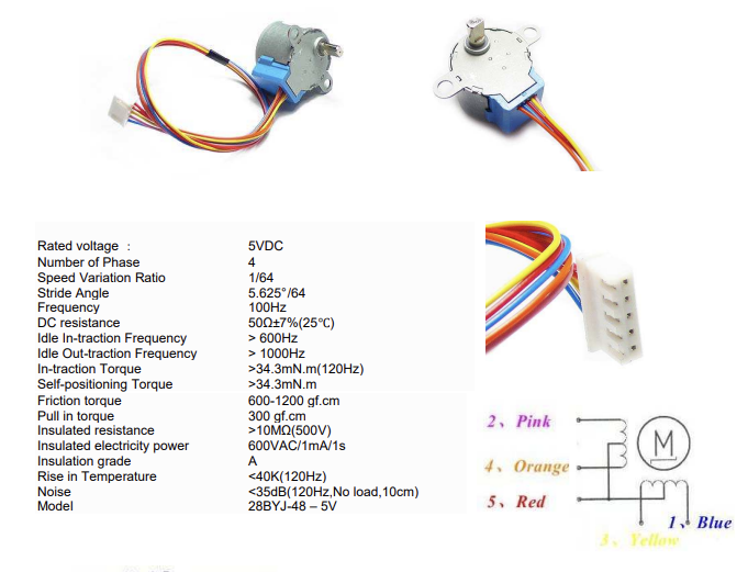 스텝모터는 28BYJ-48을 사용하며, 해당 모델은 5개의 핀으로 구성되어 있고 상세 스펙은 아래와 같다.
