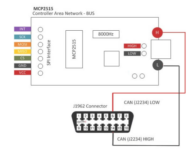 위 사진과 같이, MCP2515의 CAN-H는 차량의 CAN-L와, MCP2515의 CAN-L은 차량의 CAN-H와 연결하면 된다.